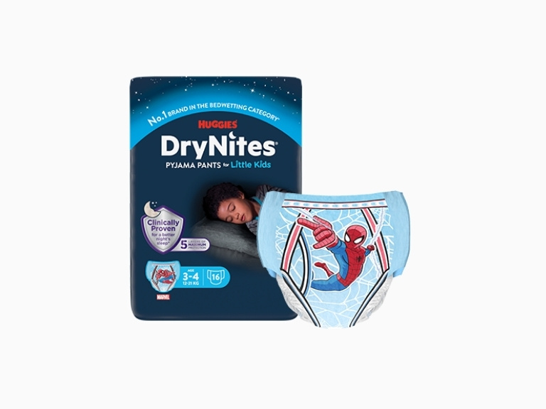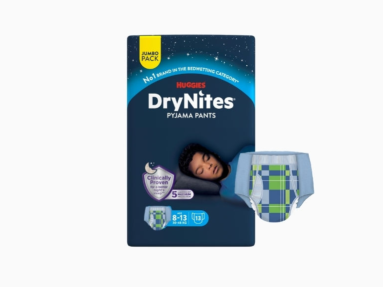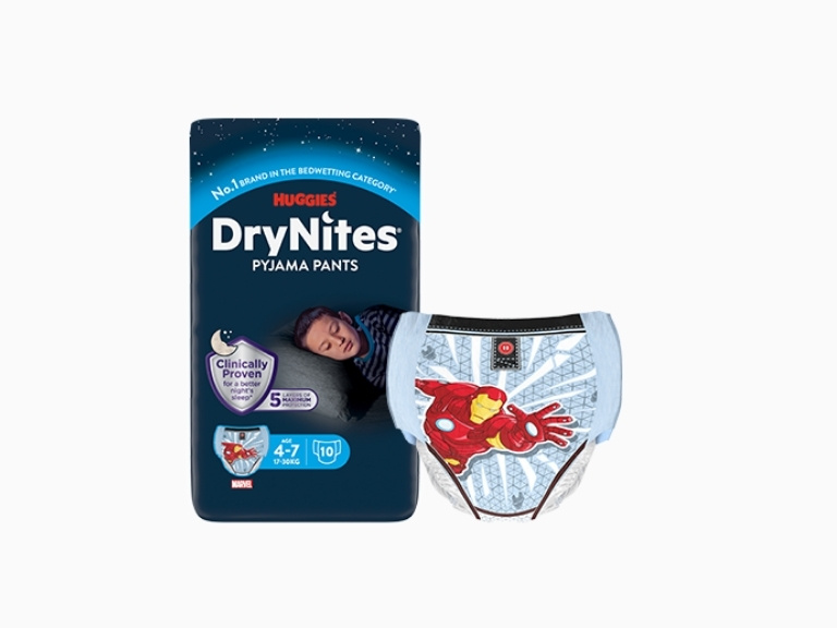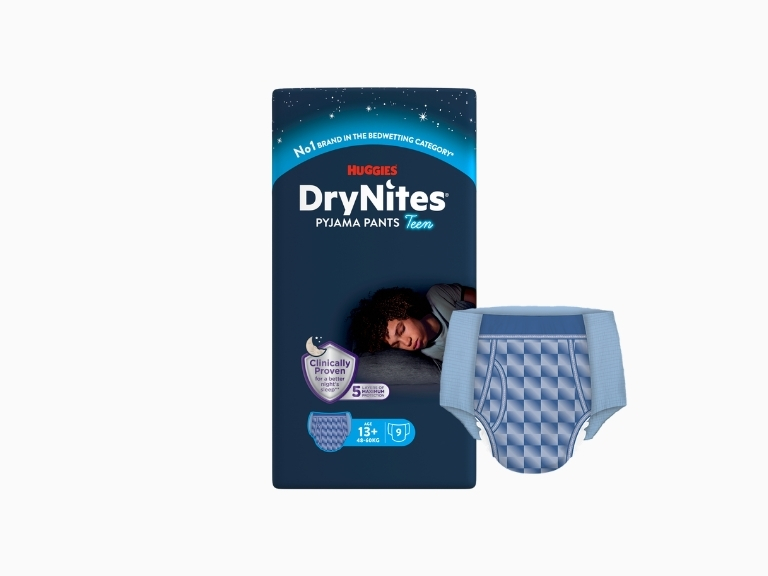 DryNites absorberende nachtbroekjes zijn de ideale oplossing voor kinderen van 3 tot 19 jaar die in bed plassen. Ultra-absorberend dankzij de 5 lagen bescherming aangepast aan de lichaamsbouw van jongens. Ze zijn comfortabel, discreet en vertragen de zindelijkheidstraining ‘s nachts niet. Ze bieden maximale bescherming en zorgen ervoor dat je kind zowel thuis als buitenshuis rustig kan slapen en weer zelfvertrouwen krijgt!