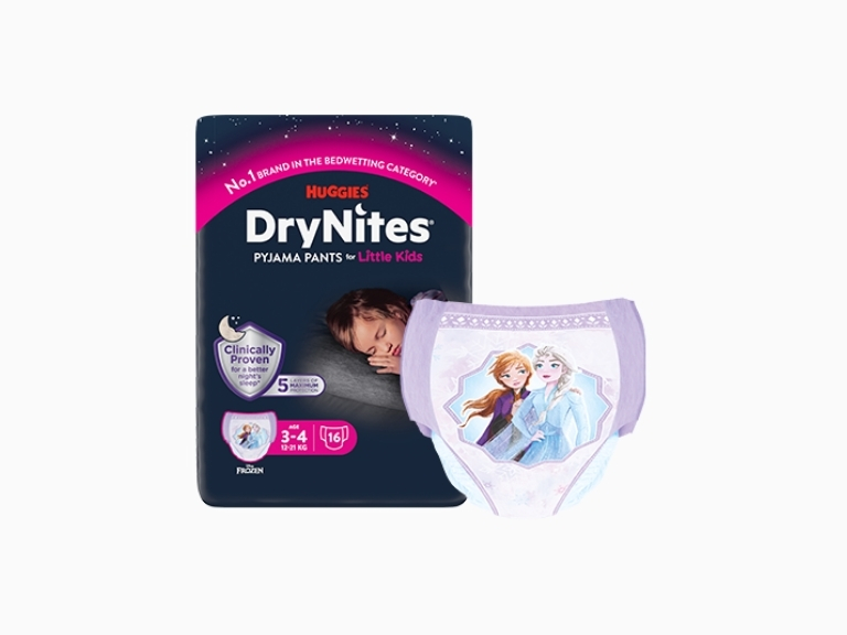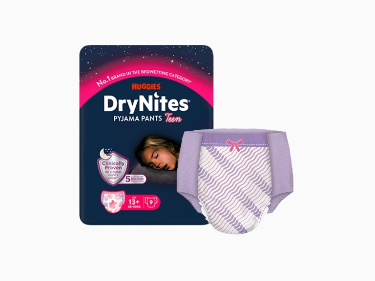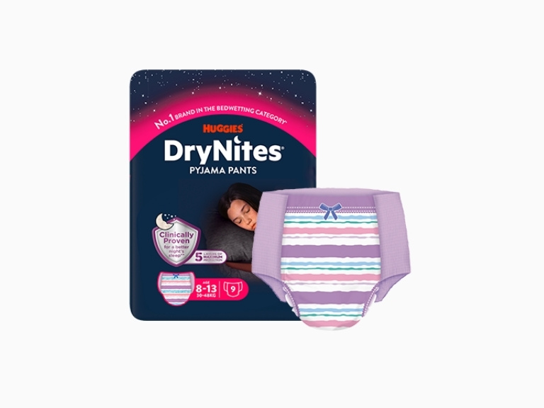DryNites absorberende nachtbroekjes zijn de ideale oplossing voor kinderen van 3 tot 19 jaar die in bed plassen. Ultra-absorberend dankzij de 5 lagen bescherming aangepast aan de lichaamsbouw van meisjes. Ze zijn comfortabel, discreet en vertragen de zindelijkheidstraining ‘s nachts niet. Ze bieden maximale bescherming en zorgen ervoor dat je kind zowel thuis als buitenshuis rustig kan slapen en weer zelfvertrouwen krijgt!
